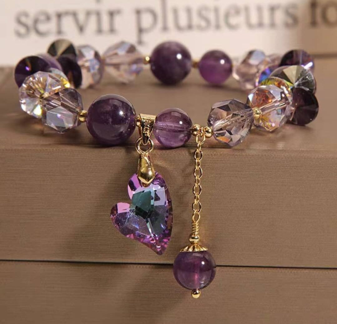Designed with a heart-shaped crystal charm, this bracelet symbolizes love, healing, and inner strength. Its timeless purple hue complements any outfit, from casual to formal, adding a touch of sophistication and charm.